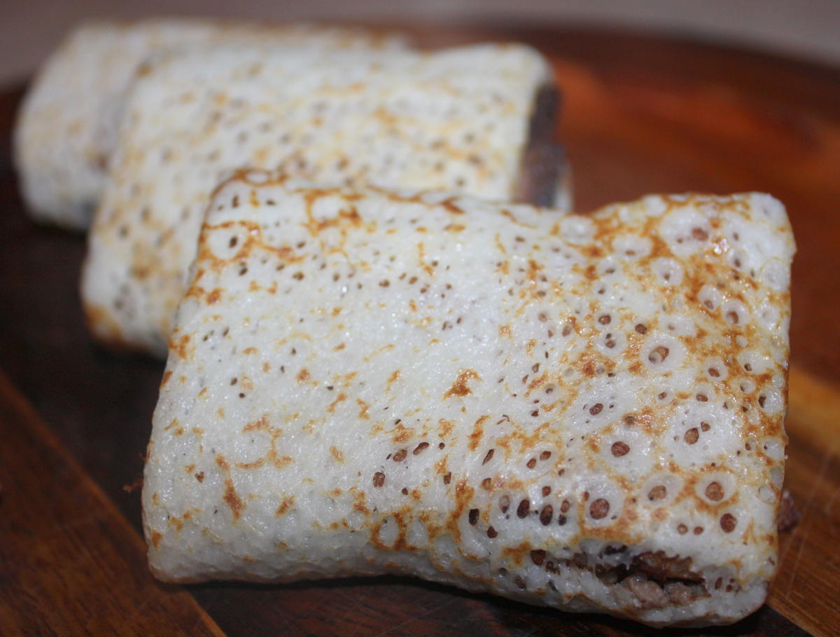 Блинчики тонкие из опарного дрожжевого теста с начинкой из говяжьего фарша.
