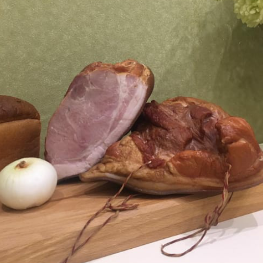 Варено- копченый окорок , нашего собственного производства имеет очень нежный , слабо- соленый вкус, с тончайшими нотками копчения. Никакой химии, все изготовлено из натуральных продуктов, исключительно щадящим путем. Мясо из которого мы производим нашу продукцию, мы преобретаем у соседских фермеров, с которыми работаем уже более 15 лет. Животные выращены на свежем воздухе, исключительно на натуральных кормах. Поэтому наши продукты всегда вкусные , свежие и полезные.