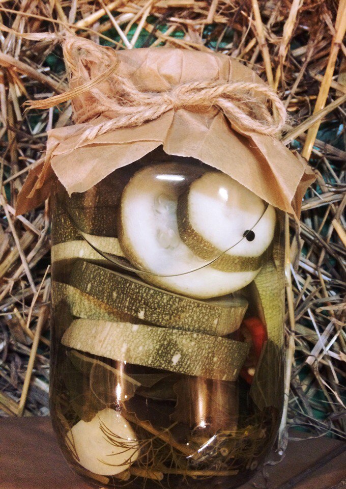 Кабачки с огорода маринованные с зеленью. Банка стеклянная 1.5л. Количество ограничено, потому как используются овощи и фрукты выращеные только на нашем огороде.