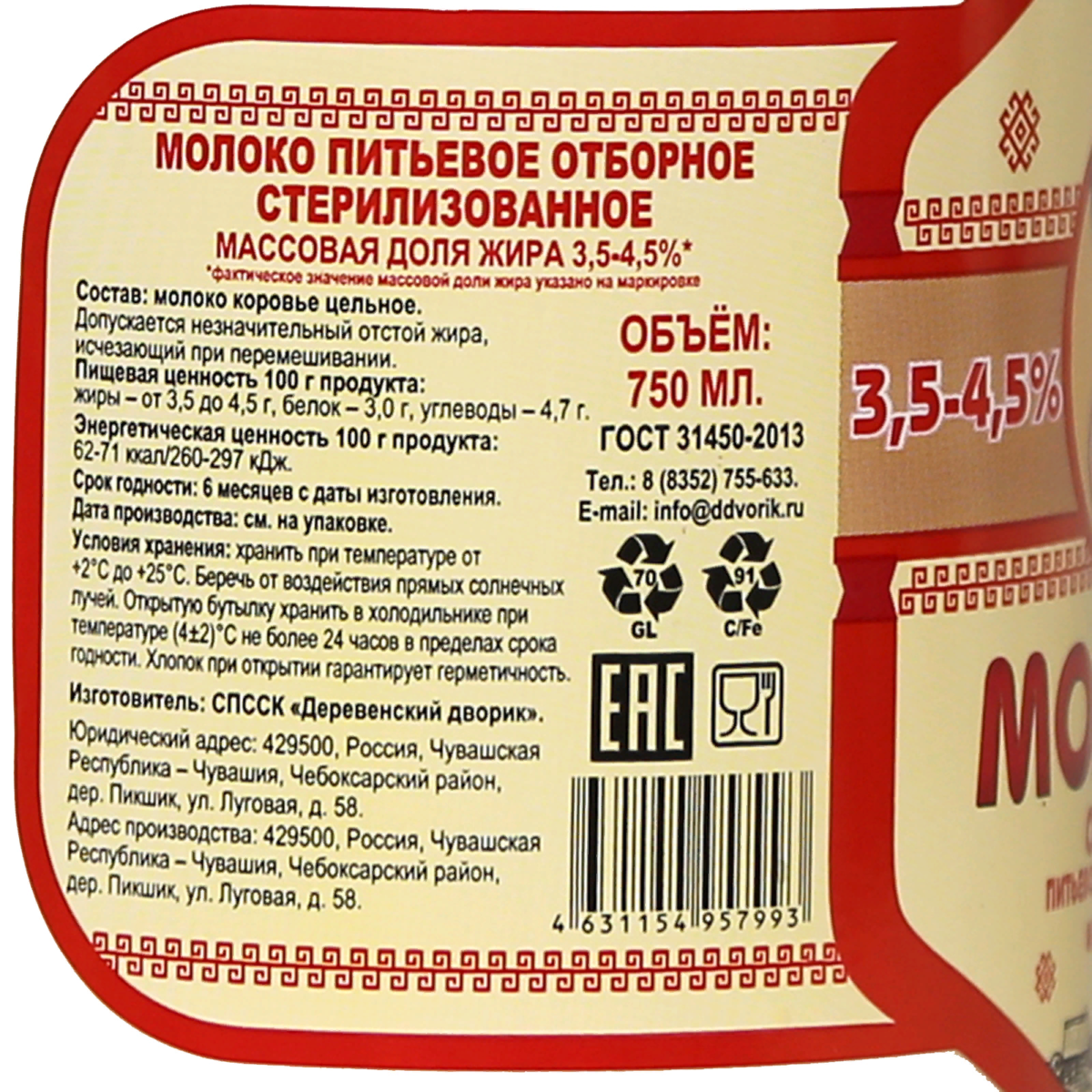 Молоко коровье питьевое отборное стерилизованное фермерское мдж 3,5-4,5% премиум класса Стеклянная тара 750 мл