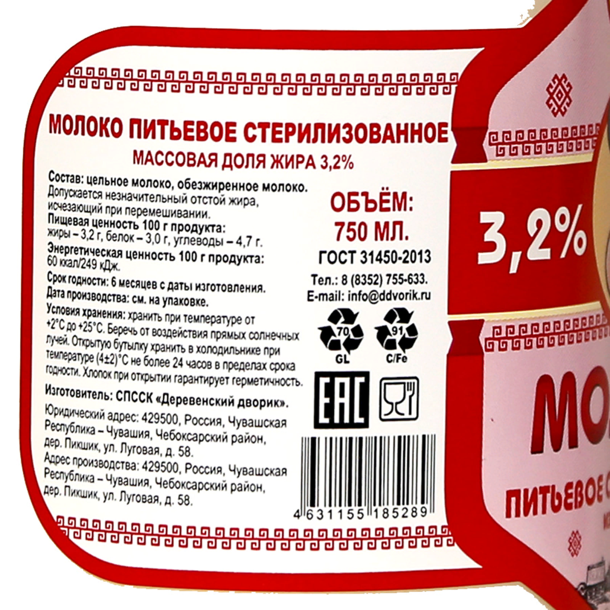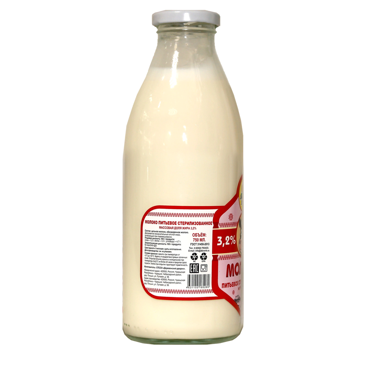 Молоко коровье питьевое стерилизованное фермерское мдж 3,2% премиум класса Стеклянная тара 750 мл