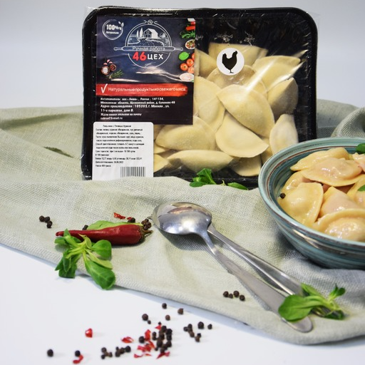 Пельмени из курицы/ фарш/ филе куриной грудки, лук репчатый, соль, перец, Тесто/Мука пшеничная, яйцо, масло подсолнечное, соль, вода