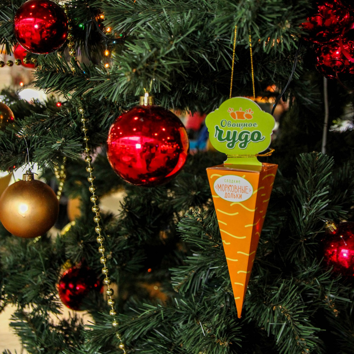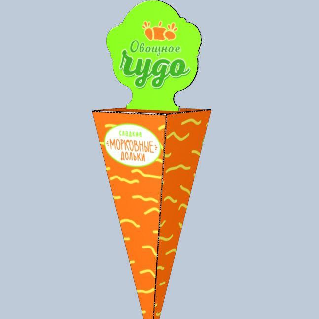 Продукт поставляется в картонной упаковке (90 гр.) виде «морковки», предполагается наличие золотой петельки для использования в качестве украшения на новогоднюю ёлку, размеры 22х5х5 см.