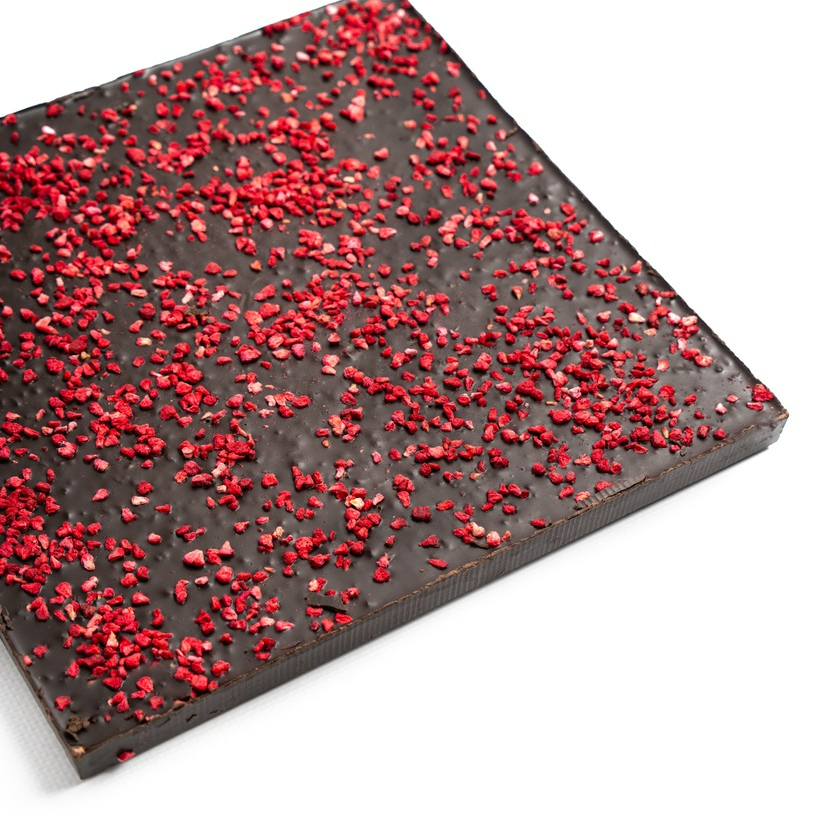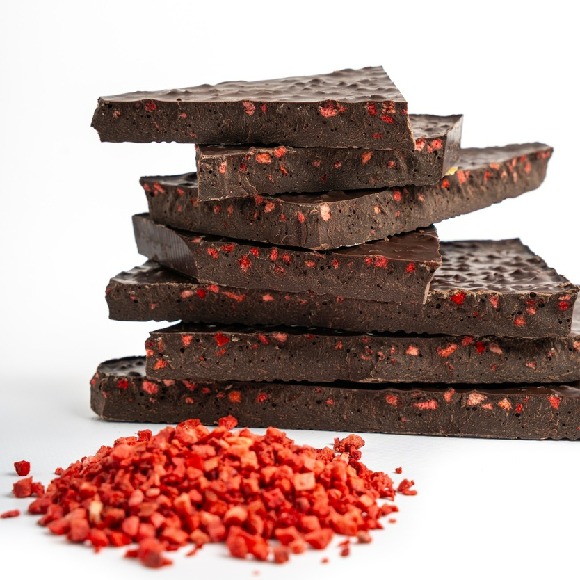 Аромат и душистость шоколада подарит нерафинированное масло какао, а сублимированная клубника добавит ягодную сладость, подчеркивая вкус горького шоколада. Сублимированные ягоды сохраняют свой природный вкус и увеличивают пищевую ценность, даря вам больше пользы, чем свежие!