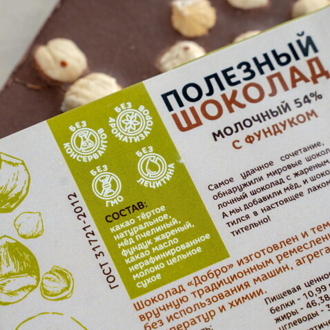 Состав:Какао тёртое натуральное, мёд пчелиный, фундук жареный, какао масло нерафинированное, молоко цельное сухое.