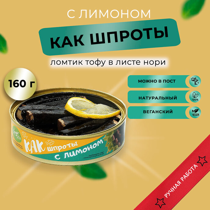 "КАК шпроты с лимоном": копченый тофу (соевые бобы, Россия без ГМО, вода, соль морская, соевый соус, масло подсолнечное рафинированное, кальций хлористый, лимонная кислота), водоросли нори, лимон.
