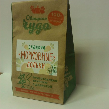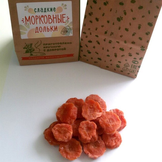 Продукт произведен из свежей моркови, выращенной на полях Грязовецкого района Вологодской области, выварен в сахарном сиропе, высушен и посыпан сахарной пудрой.