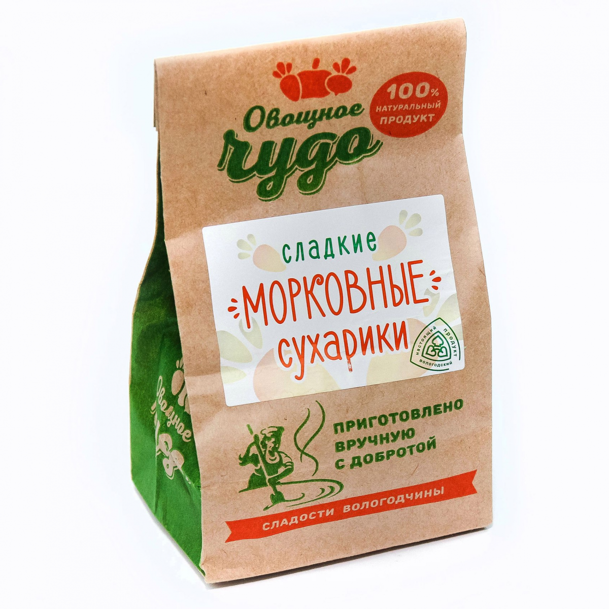 Это тонко нарезанные ломтики моркови, вываренные в сахарном сиропе и высушенные в специальной сушилке. Сухарики получаются сладкие и хрустящие. Продукт поставляется в бумажных пакетах крафт (130 гр.).