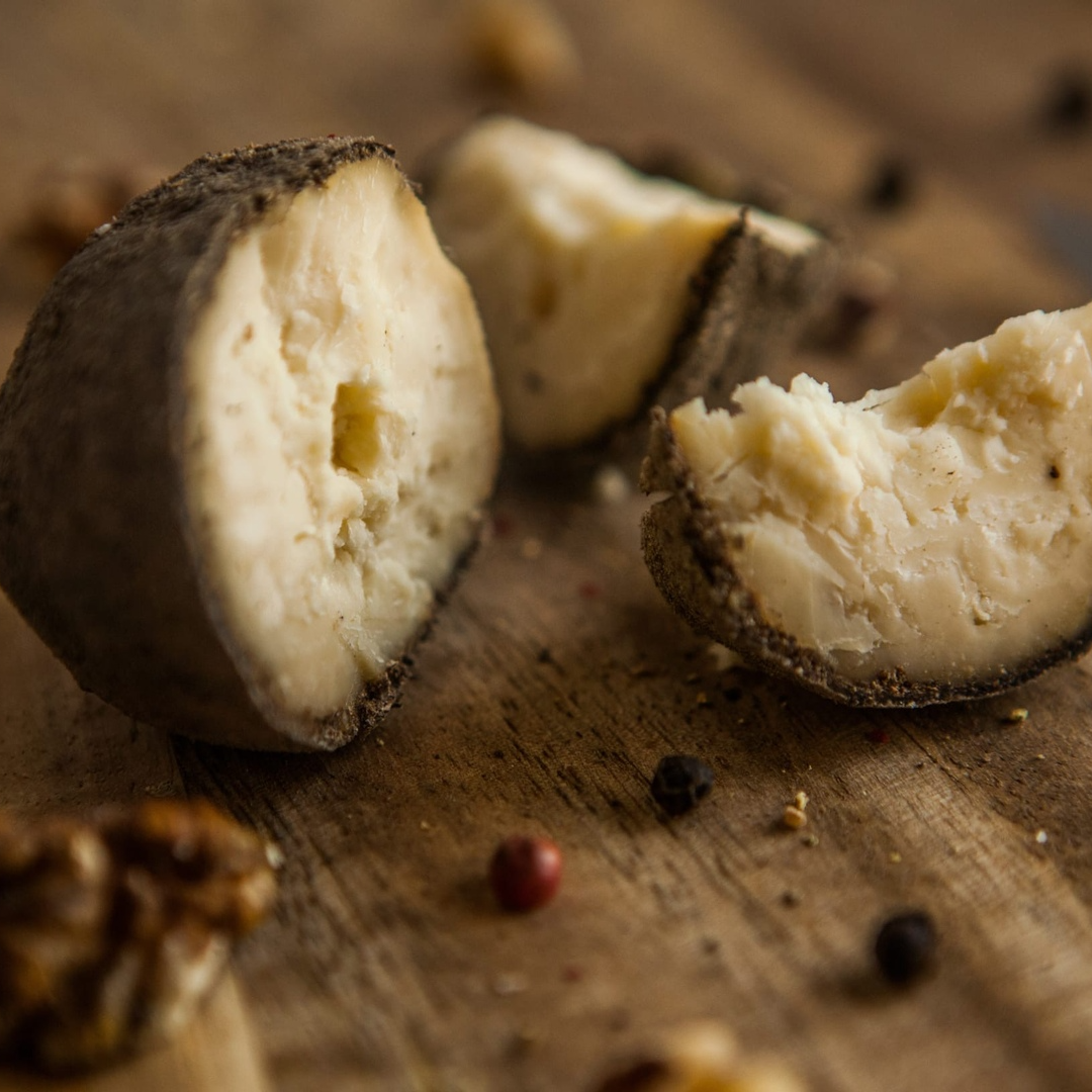 Сырный шарик посыпанный черным перцем. Текстура плотная, закрытая, ломкая, рассыпчатая. Вкус сильный, пикантный, острый, с лёгкой кислинкой и сливочным послевкусием.