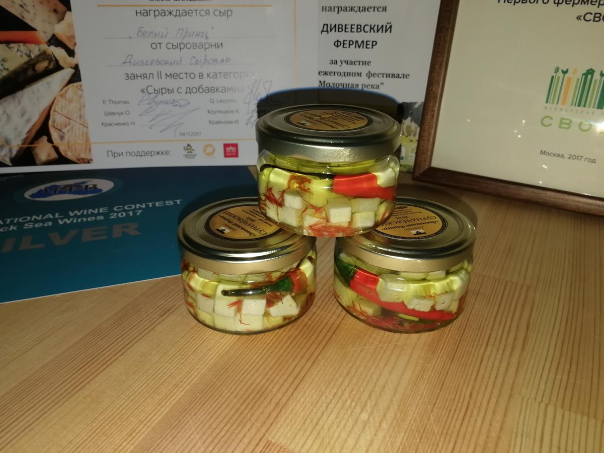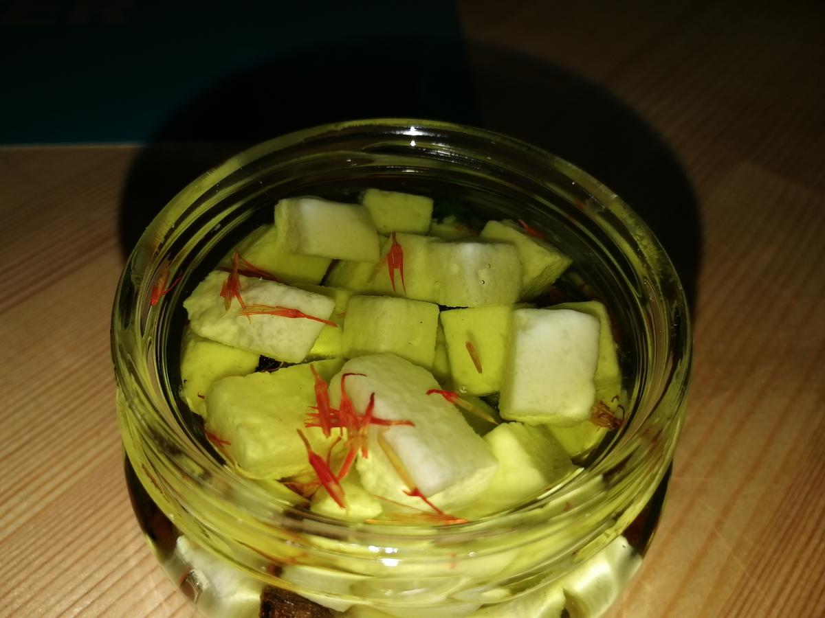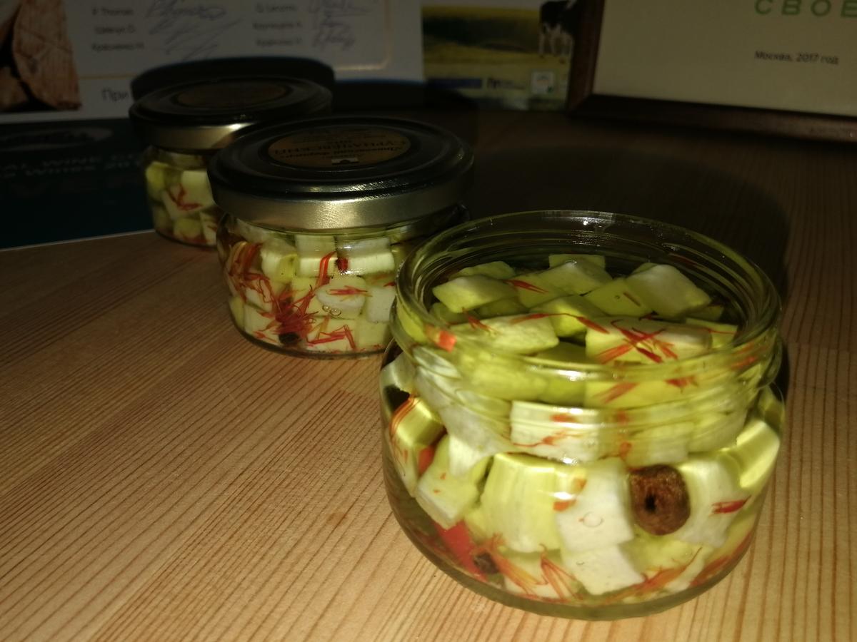 Сыр "Сурначёвкий mix" (козий в масле)- Козий твёрдый или полу-твёрдый сыр, нарезан кубиками и уложен в стеклянную баночку, объёмом 100 миллиграмм, с добавлением приправ и шафрана. Залит оливковым маслом.