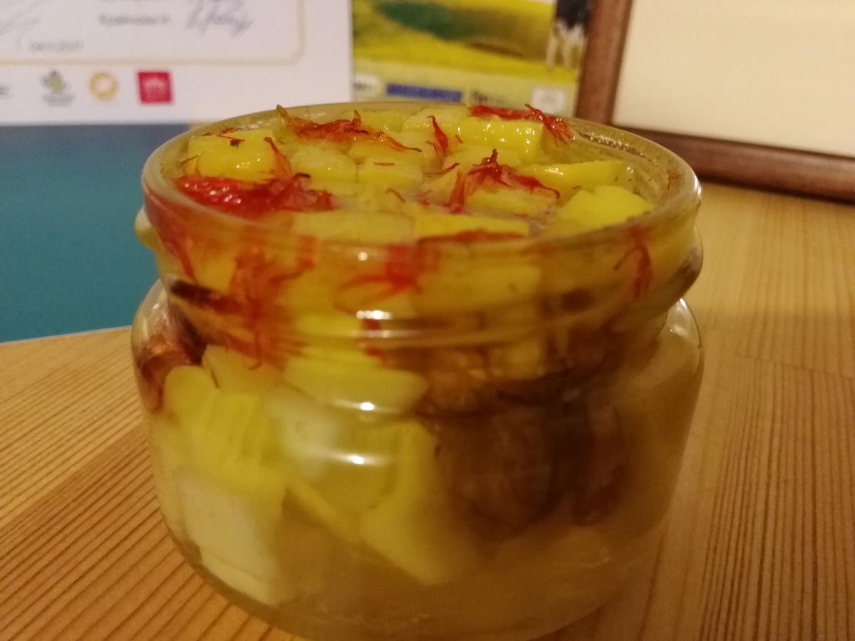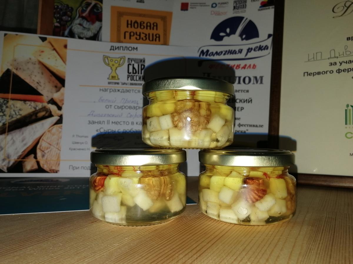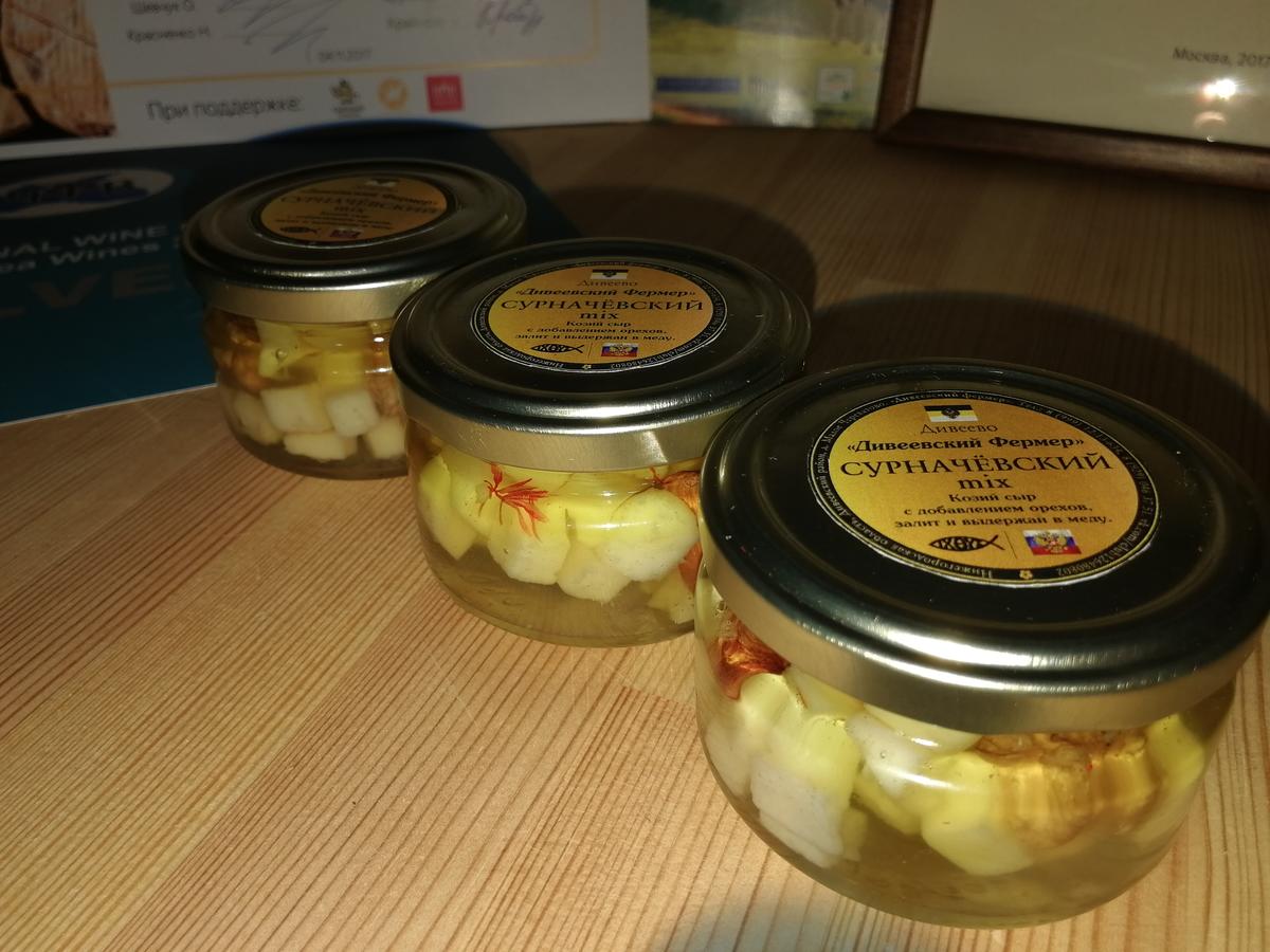 Сыр "Сурначёвский mix" (козий в меду) - Козий твёрдый или полу-твёрдый сыр, нарезан кубиками и уложен в стеклянную баночку, объёмом 100 миллиграмм, с добавлением орехов и шафрана.