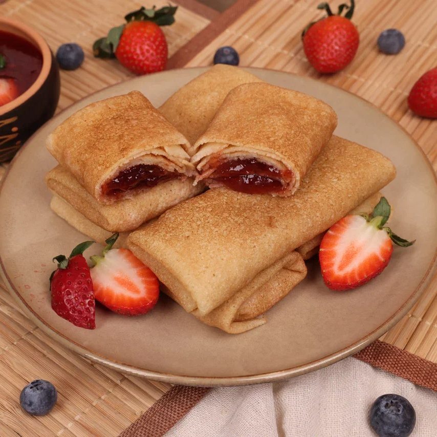 Блинчики с клубникой. Состав: мука пшеничная в/с, вода питьевая, яичный меланж, сахар, соль поваренная пищевая, молоко, масло подсолнечное, джем клубничный.