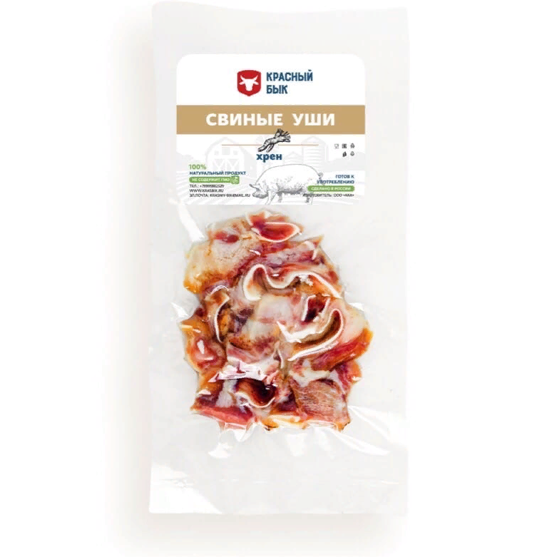 Оптовая продажа варено-копченых свиных ушек и пятаков, без вредных добавок и ГМО. Произведено с соблюдением ГОСТа, ТУ и санитарно-эпидемиологических требований. В ассортименте: Ушки и пятаки свиные, с черным перцем, деликатесные, шашлычные, с чесноком, с горчицей, пикантные, с укропом, с аджикой, с хреном, чили Фасовка: 100 г и 500 г . ТМ Красный Бык®