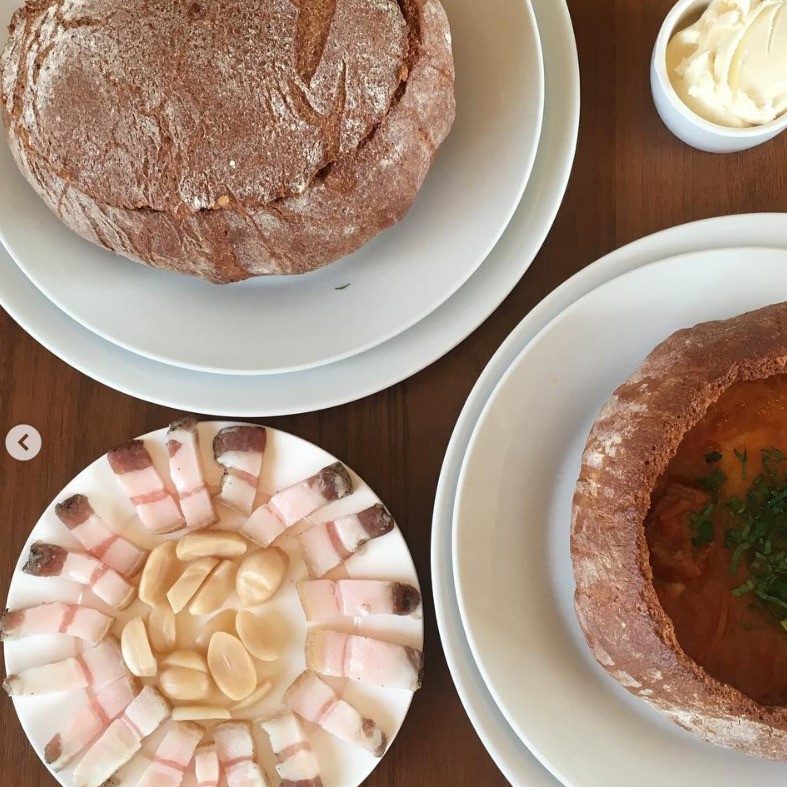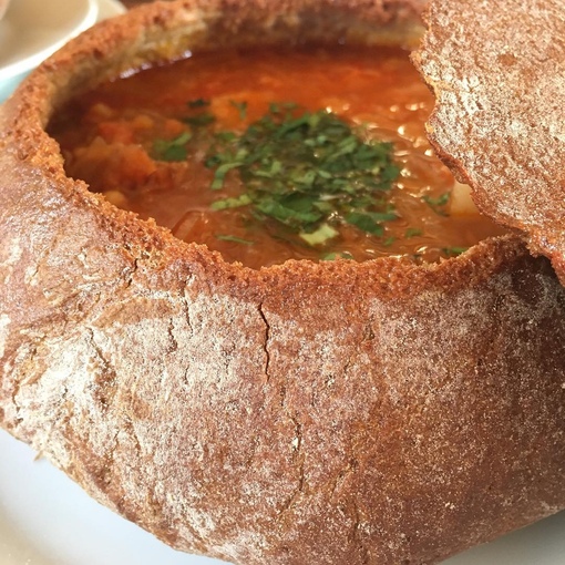Наваристый украинский борщ из русской печи в пропеченном каравае. Подается с чесноком, салом и сметаной.