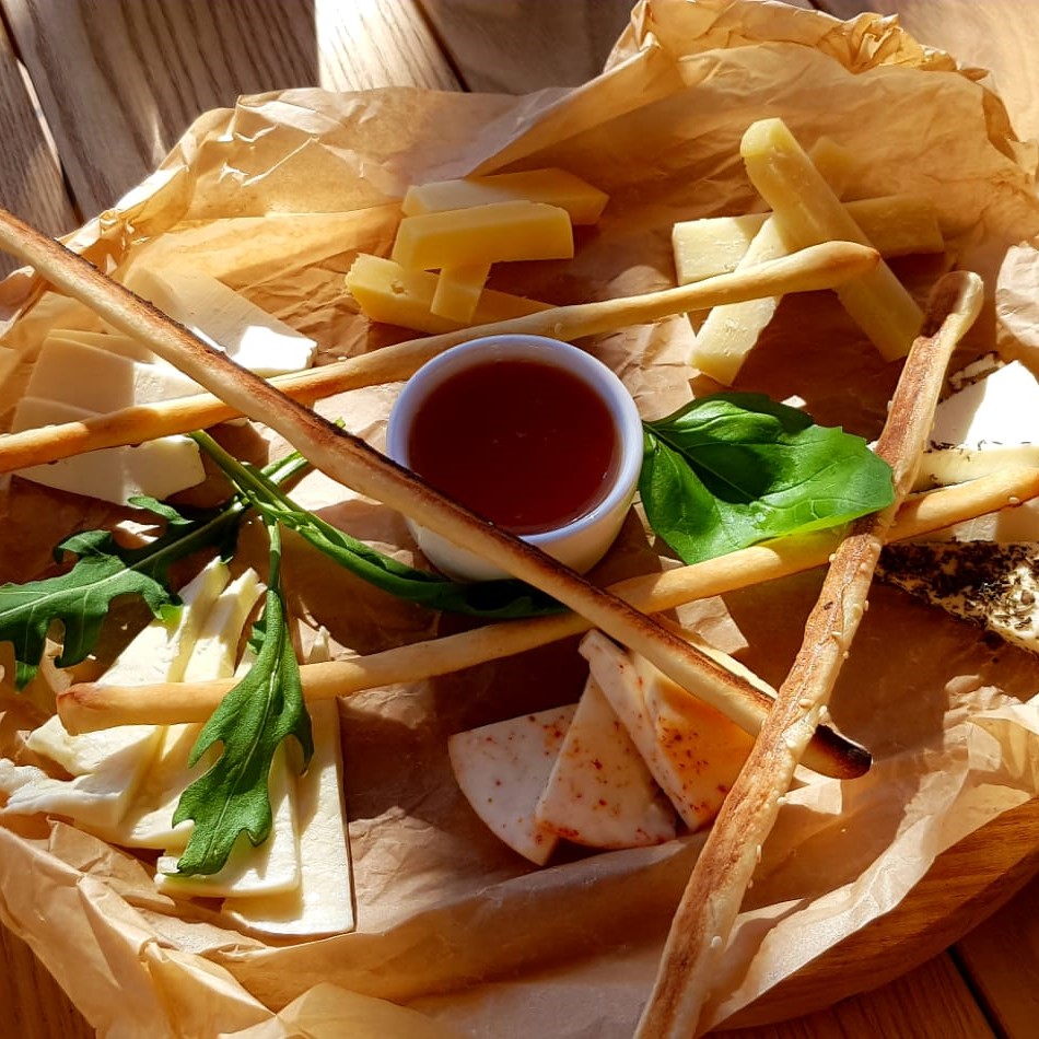 Сыры подаются с фермерским джемом и хлебными палочками.