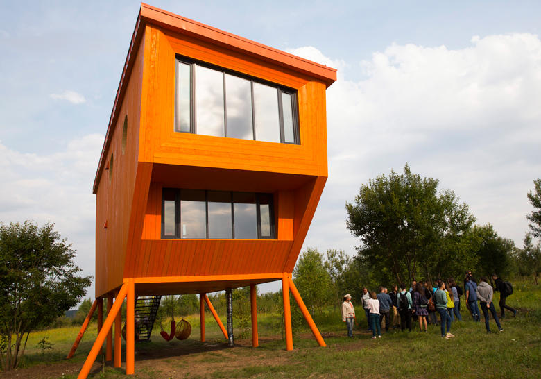 Двухуровневый жилой объём с двухсветным пространством внутри, “рогами”- трубами и крыльцом -“хвостом”. “Бока” и “брюхо” зашиваются деревом, “спина”-кровля решается в крашенном металле, но все объединяется единым ярким цветом! По аналогии с известной картиной, у нас получилось -“Гуляние оранжевого Быка”.
