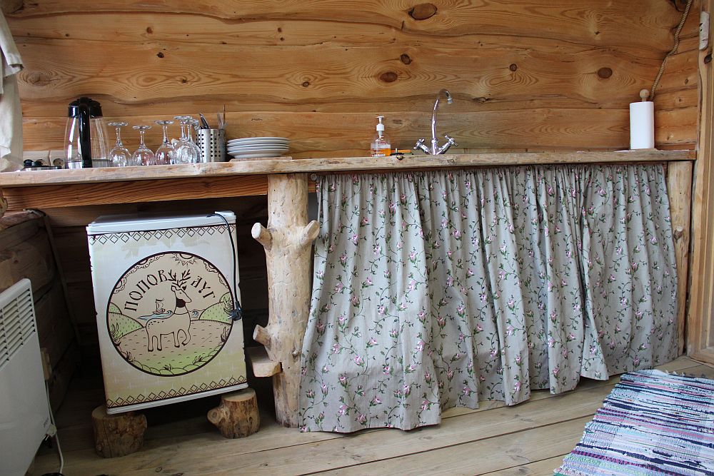 В каждом домике имеется санузел с душем (также прилагаются средства гигиены и чистейшие свежие полотенца), электрообогреватель, электрический чайник, набор посуды, кухонная мойка, а также Wi-Fi.
