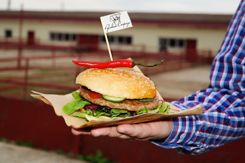 Оригинальный бургер с котлетой из страусиного мяса в домашней булочке, хрустящий салат, помидоры, огурцы и конечно же соус